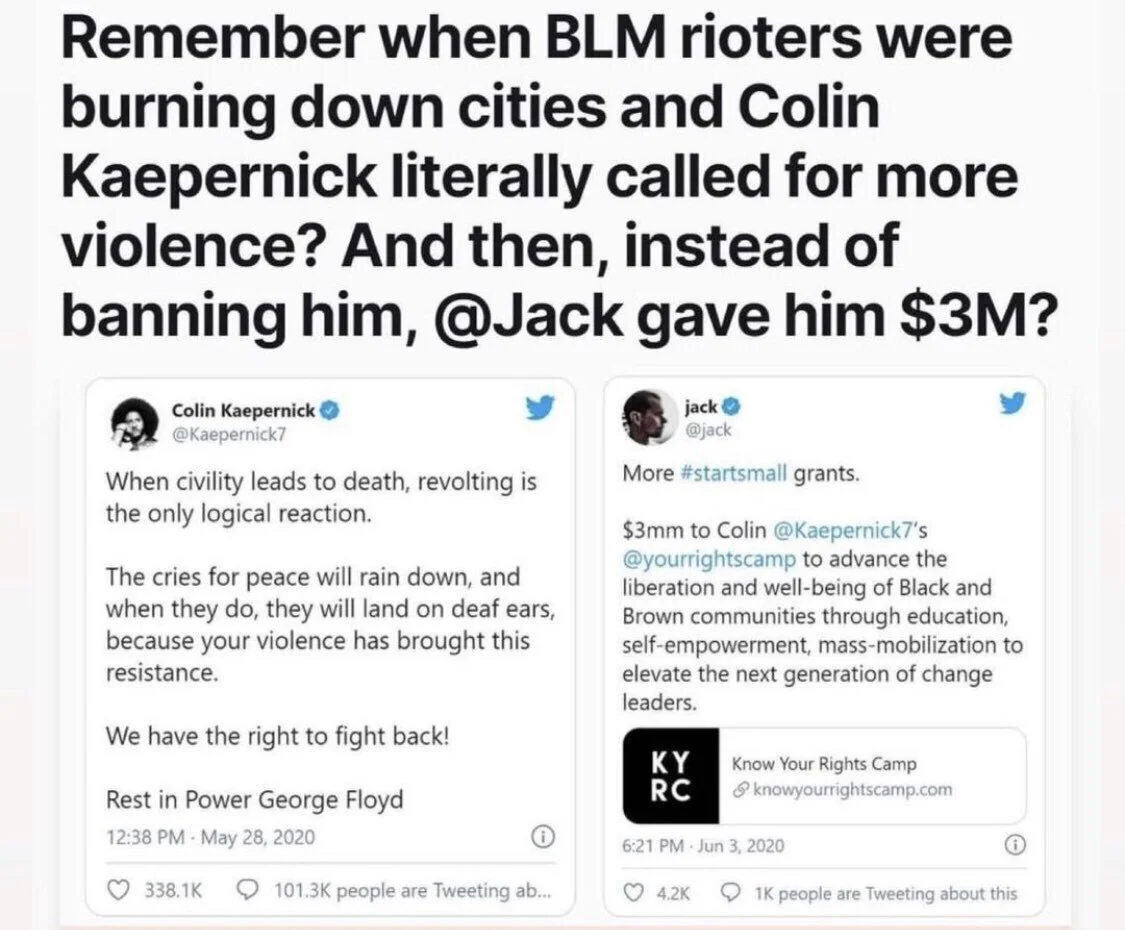Colin Kaepernick used the word “fight” in the above tweet on the 28th of May, at the exact moment when it literally meant setting Minneapolis aflame and doing what you could to kill, maim, or injure cops.Then a few days later, after Kaepernick’s call to arms had played a major part in the riots spreading across the nation, Dorsey proudly announces that he is rewarding him by dropping $3 million into his lap. And this is the sanctimonious sh*t who is preaching to us and deplatforming a duly elected President for “incitement to violence” even though Trump (a) never told his supporters to storm the Capitol and (b) quickly denounced those who had committed crimes by doing so.