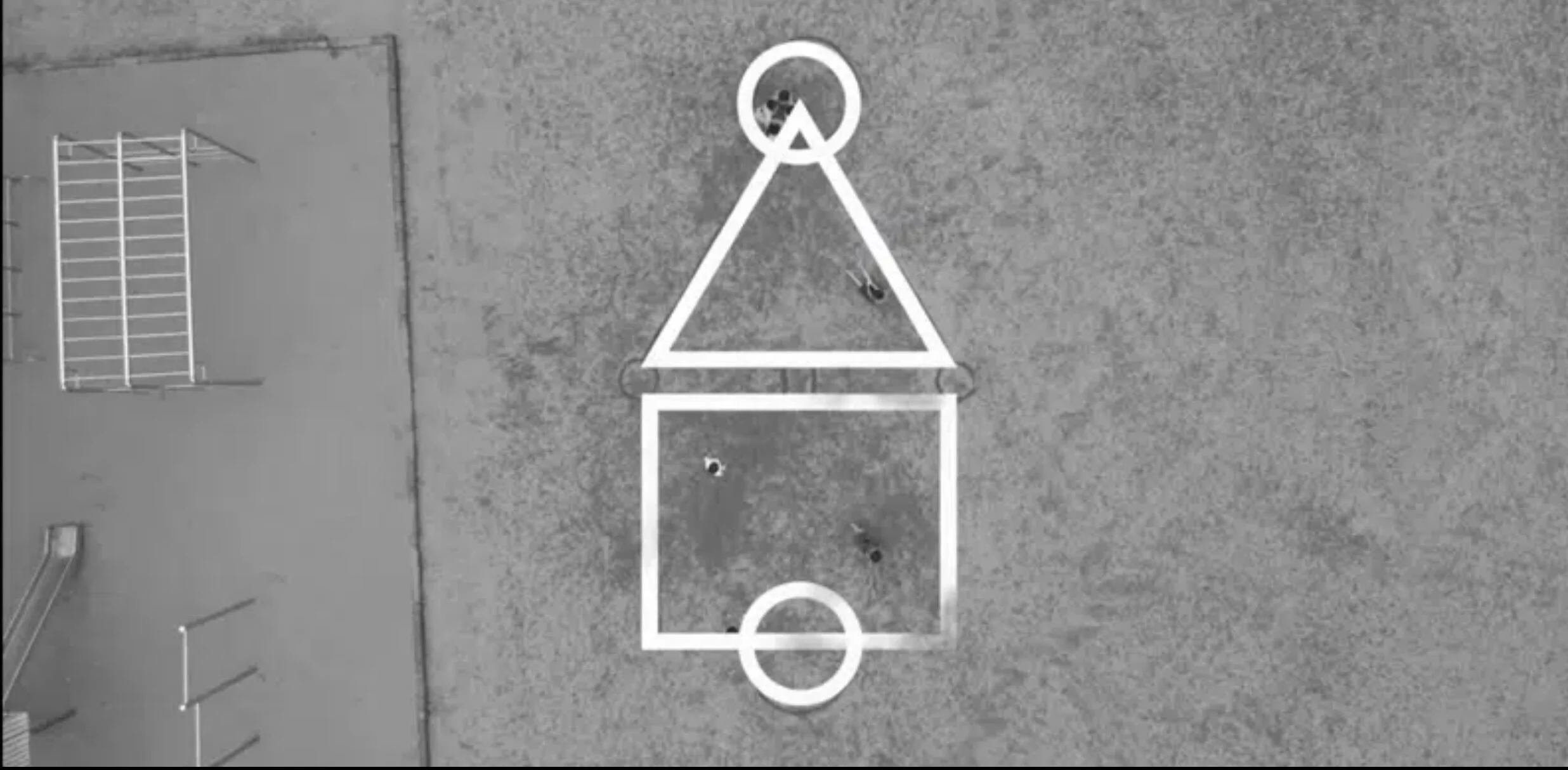 In the intro scene of the first episode the camera shows a symbol on the playground of a school yard that explains the theme of the show. This outline of the game is also the main logo of the series, which illustrates the core philosophy of Squid Game. The rectangle represents the masses. The circle at the bottom of it represents those who are poor and heavily in debt. The triangle above the rectangle represents the elite ruling over the masses. The upper circle represents the all-powerful occult elite that controls the world.