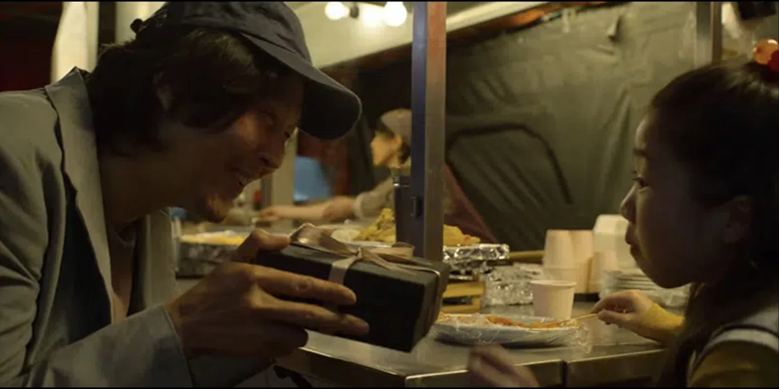 This scene foreshadows the numerous deaths by gunshot that are about to happen. Also, the gun lights fire which can refer to the bodies being incinerated. The fact that Gi-hun gives this gift to his daughter is in line with the overall agenda of exposing the youth to the elite’s sickness.