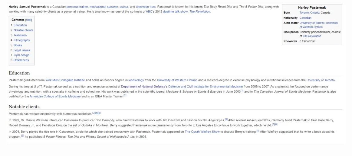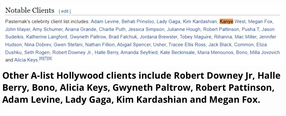 Someone recently removed from Harley Pasternak’s Wikipedia entry two main things. Any reference to Kanye West. And the lengthy list of his celebrity clients. Curious, isn’t it?