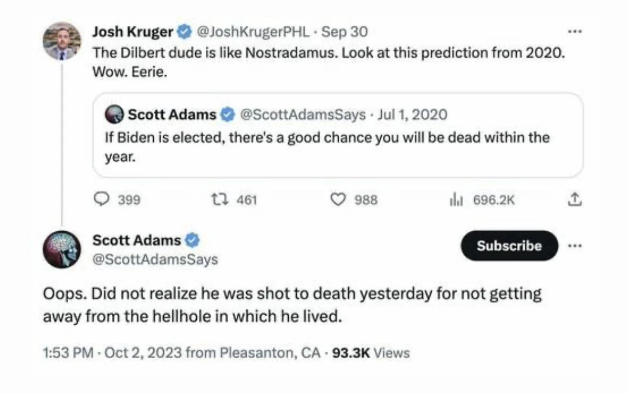 Kruger frequently mocked conservatives on X, ironically calling Dilbert creator Scott Adams “Nostradamus” on Saturday for predicting that people would be dead “within the year” of Biden’s election.